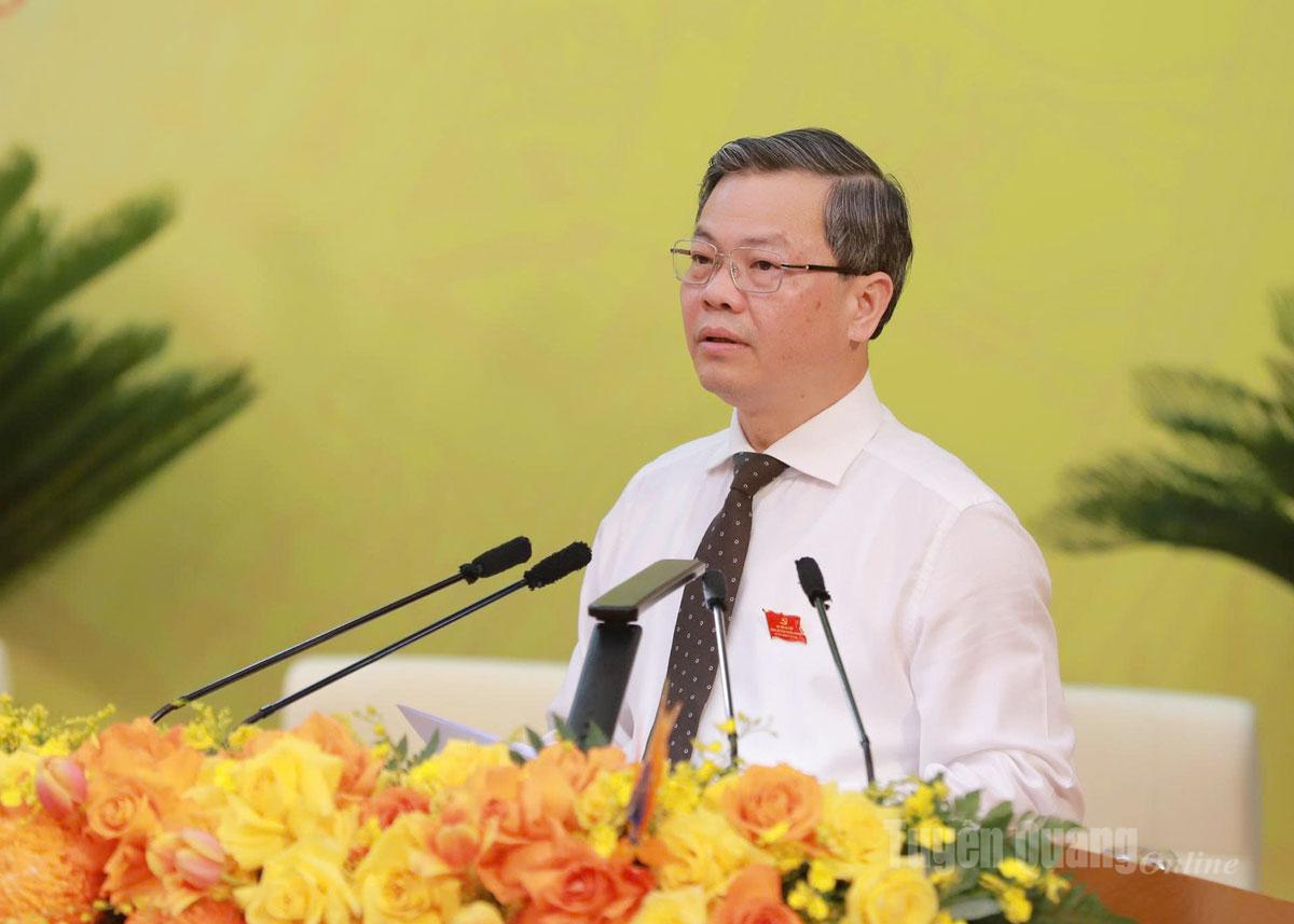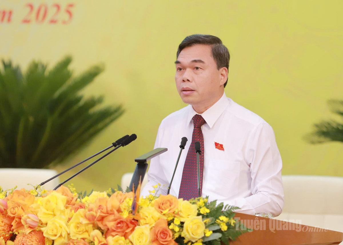 Đồng chí Nguyễn Văn Sơn, Phó Bí thư Tỉnh ủy, Chủ tịch HĐND tỉnh trình bày Báo cáo tổng hợp ý kiến tham gia vào dự thảo văn kiện Đại hội đại biểu toàn quốc lần thứ XIV của Đảng - Ảnh Thanh Phúc.