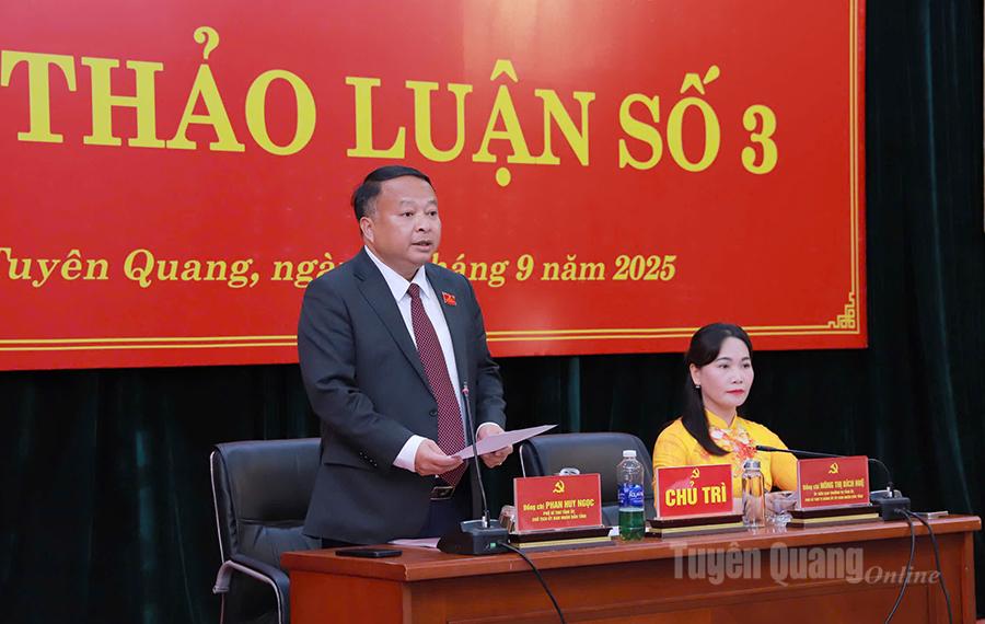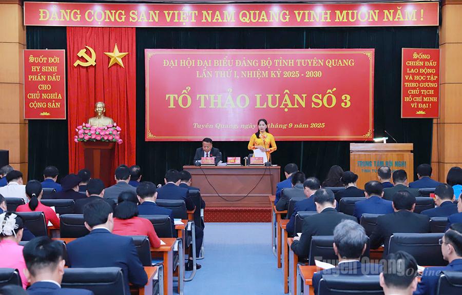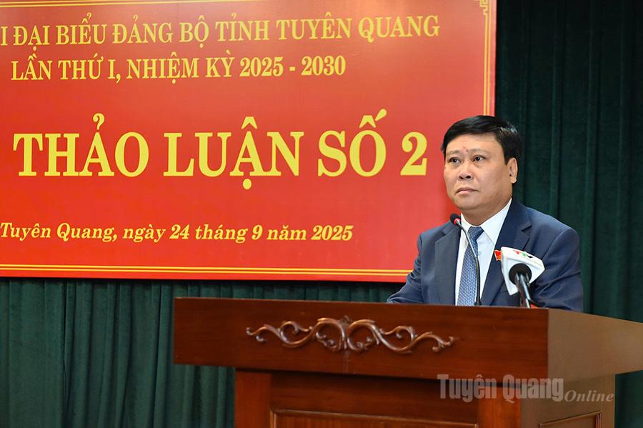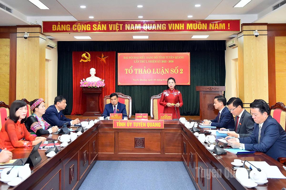 Đại biểu thảo luận về 9 vấn đề trọng tâm trong công tác xây dựng Đảng, tổ chức bộ máy, cán bộ và thúc đẩy phát triển kinh tế - xã hội như: Tham mưu sắp xếp tổ chức bộ máy các cơ quan, đơn vị, địa phương đảm bảo tinh gọn, hoạt động hiệu năng, hiệu lực, hiệu quả; phát triển sản xuất nông, lâm nghiệp, hàng hóa theo chuỗi liên kết, đẩy mạnh ứng dụng khoa học công nghệ nhằm nâng cao chất lượng, giá trị, hiệu quả bền vững ngành Nông nghiệp và Môi trường tỉnh Tuyên Quang đến năm 2030; một số giải pháp đẩy mạnh ứng dụng khoa học, công nghệ và chuyển đổi số trên địa bàn tỉnh Tuyên Quang - động lực then chốt cho phát triển nhanh và bền vững; khai thác tiềm năng, lợi thế để đẩy mạnh phát triển du lịch trở thành ngành kinh tế quan trọng của tỉnh; một số giải pháp phát triển giáo dục và đào tạo bền vững trên địa bàn tỉnh Tuyên Quang, giai đoạn 2025-2030; nâng cao chất lượng công tác bảo vệ, chăm sóc sức khỏe cho Nhân dân; nâng cao chất lượng sinh hoạt cấp ủy, chi bộ và xây dựng chi bộ "4 tốt"; giải pháp triển khai thực hiện các chính sách dân tộc, tôn giáo trong tình hình mới; xây dựng tố chức cơ sở Đảng trong sạch, vững mạnh ở các chi bộ vùng biên giới.