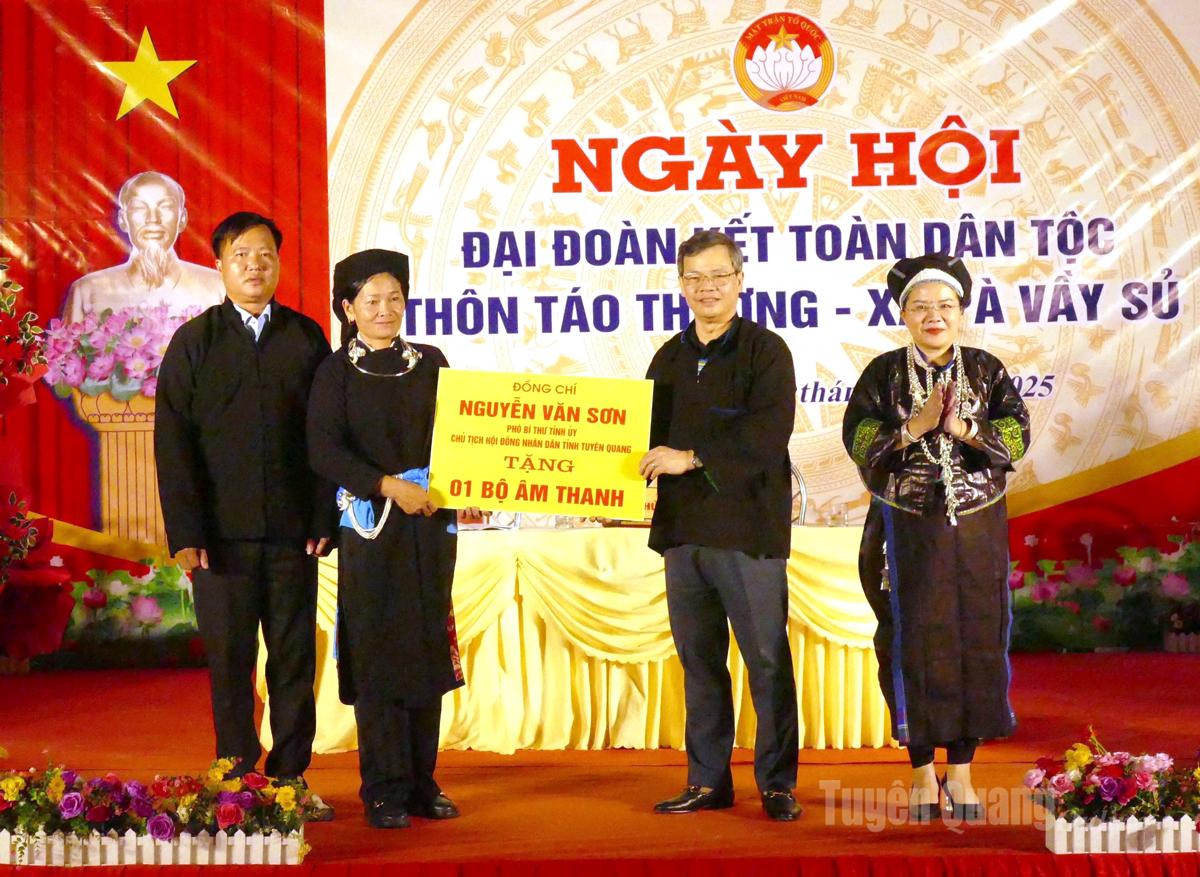 Đồng chí Phó Bí thư Tỉnh ủy, Chủ tịch HĐND tỉnh Nguyễn Văn Sơn tặng quà chúc mừng Ngày hội đại đoàn kết thôn Táo Thượng.