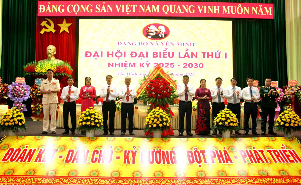 Đồng chí Phó Chủ tịch Thường trực HĐND tỉnh Hầu Minh Lợi và các đồng chí lãnh đạo tỉnh tặng lẵng hoa, chúc mừng Đại hội đại biểu Đảng bộ xã Yên Minh. Ảnh: Phạm Hoan.