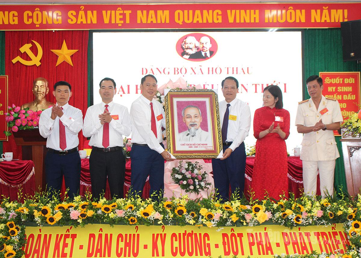 Đồng chí Vân Đình Thảo, Ủy viên BTV Tỉnh ủy, Giám đốc Sở Tài chính tặng Đại hội Đảng bộ xã Hồ Thầu bức chân dung Chủ tịch Hồ Chí Minh.