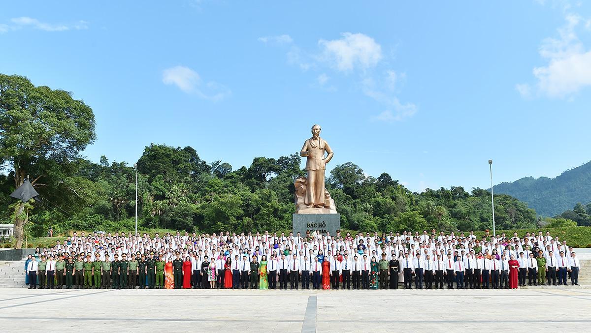 Đoàn đại biểu dự Đại hội Đảng bộ tỉnh lần thứ I trước Tượng đài Bác Hồ ở Tân Trào. Ảnh: Thanh Phúc.