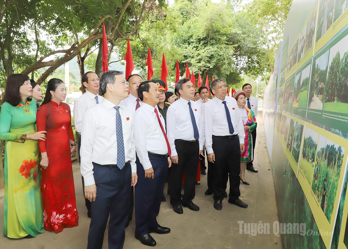 Các đồng chí Thường trực Tỉnh ủy, Ủy viên Ban Thường vụ Tỉnh ủy thăm triển lãm thành tựu phát triển KT-XH của tỉnh tại Khu Di tích Quốc gia đặc biệt Tân Trào. Ảnh: Văn Nghị.