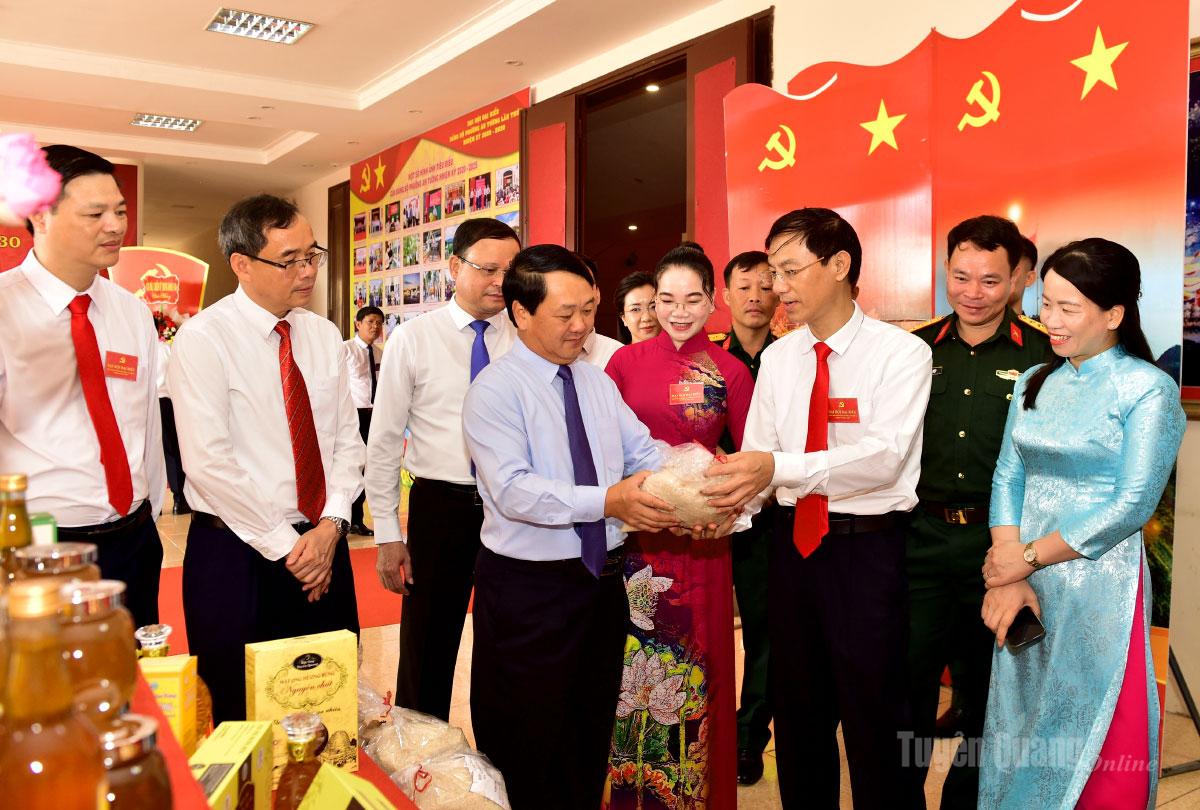 Đồng chí Bí thư Tỉnh ủy Hầu A Lềnh thăm quan gian trưng bày các sản phẩm hàng hóa tiêu biểu của phường An Tường.