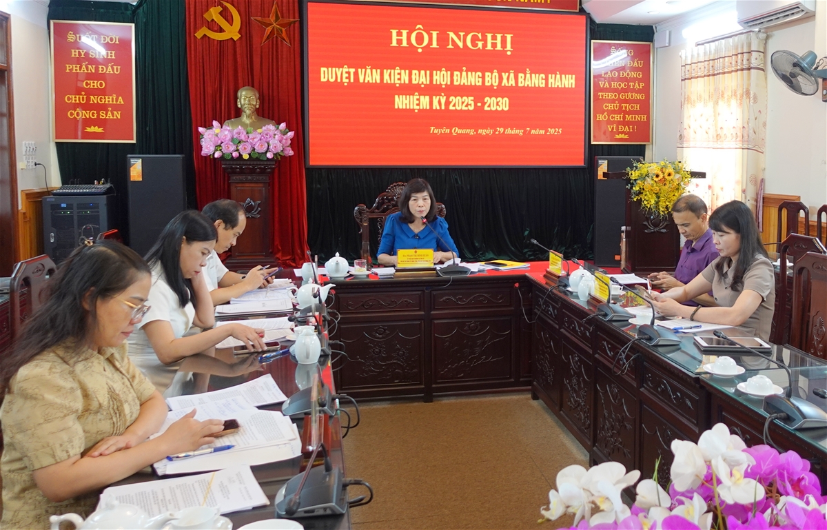 Tại cuộc họp đại diện Thường trực Đảng ủy xã Bằng Hành đã báo cáo công tác chuẩn bị các điều kiện phục vụ Đại hội Đảng bộ nhiệm kỳ 2025 - 2030, trình bày tờ trình về các văn kiện gồm dự thảo báo cáo chính trị, báo cáo kiểm điểm của Ban Chấp hành Đảng bộ xã, dự thảo nghị quyết đại hội. Trong đó, tập trung nêu rõ các chỉ tiêu phấn đấu, các nhiệm vụ đột phá trong dự thảo báo cáo chính trị để xin ý kiến góp ý của các đồng chí trong tổ duyệt văn kiện.