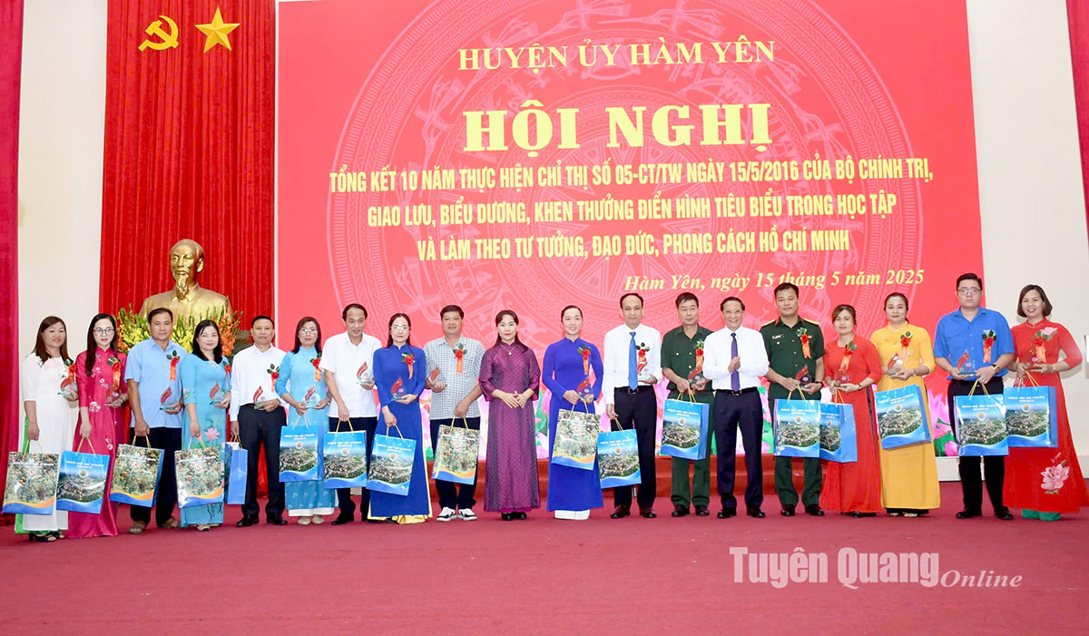 Nhân dịp này, Ban Thường vụ Huyện ủy Hàm Yên đã biểu dương, khen thưởng 17 tập thể, 52 cá nhân tiêu biểu; 13 tập thể và 35 cá nhân được Chủ tịch UBND huyện tặng Giấy khen vì có thành tích tiêu biểu trong học tập và làm theo tư tưởng, đạo đức, phong cách Hồ Chí Minh.