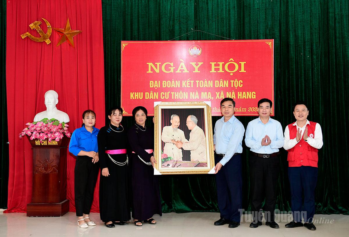 Đồng chí Ma Thế Hồng, Phó Bí thư Tỉnh ủy, Chủ tịch Ủy ban MTTQ Việt Nam tỉnh tặng Nhân dân trong thôn bức chân dung Chủ tịch Hồ Chí Minh và Bác Tôn Đức Thắng - Biểu tượng của Đại đoàn kết toàn dân tộc.