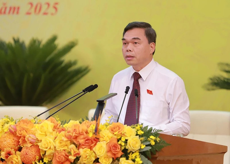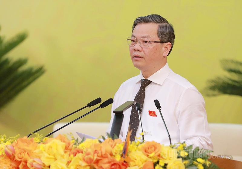 Đồng chí Nguyễn Văn Sơn, Phó Bí thư Tỉnh ủy, Chủ tịch HĐND tỉnh trình bày Báo cáo tổng hợp ý kiến tham gia vào dự thảo văn kiện Đại hội đại biểu toàn quốc lần thứ XIV của Đảng.