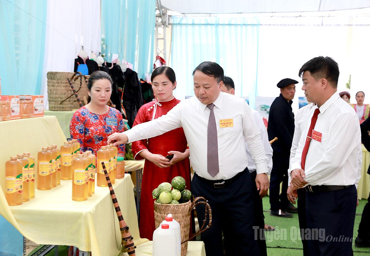 Đồng chí Phan Huy Ngọc tham quan sản phẩm nông sản đặc trưng của xã Khâu Vai trưng bày tại Đại hội.