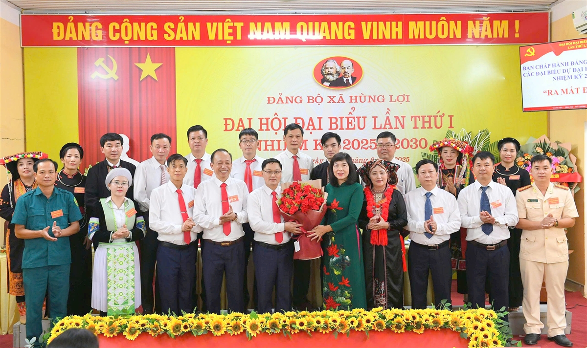 Đồng chí Phạm Thị Minh Xuân, Ủy viên Ban Thường vụ Tỉnh uỷ, Phó Chủ tịch HĐND tỉnh tặng hoa chúc mừng Ban Chấp hành Đảng bộ xã Hùng Lợi nhiệm kỳ 2025-2030.