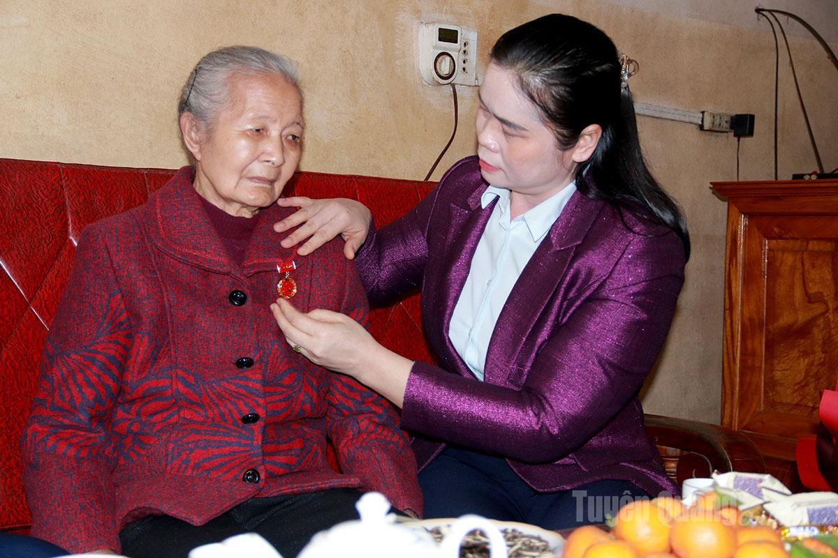 Phó Trưởng đoàn ĐBQH hoạt động chuyên trách tỉnh Ma Thị Thúy gắn Huy hiệu 60 năm tuổi Đảng cho đảng viên Nguyễn Thị Thịnh, Chi bộ thôn Đất Đỏ.