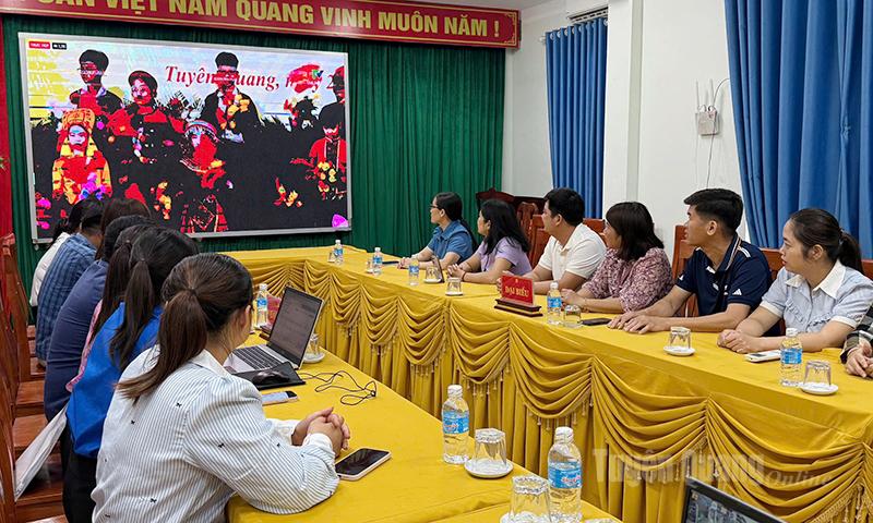 Nhân viên Công ty Gang thép Tuyên Quang chuẩn bị màn chiếu để xem truyền hình trực tiếp Đại hội đại biểu Đảng bộ tỉnh.