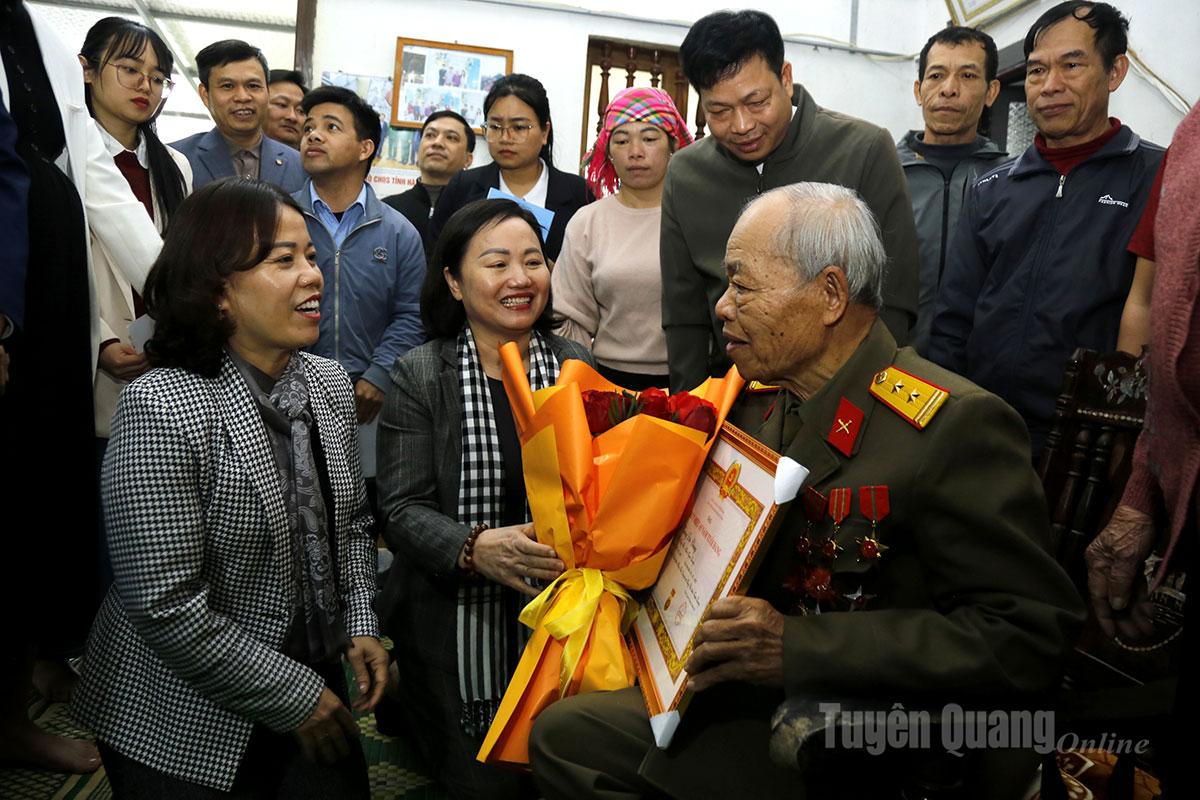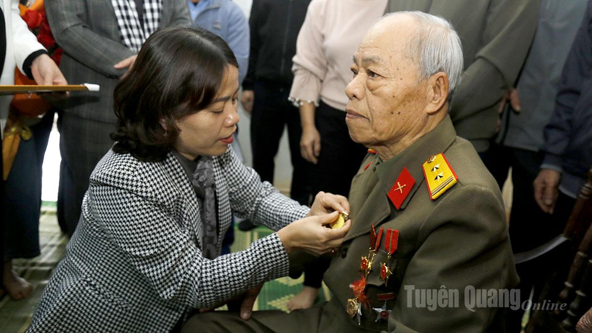 Đồng chí Lý Thị Lan, Ủy viên Ban Thường vụ Tỉnh ủy, Trưởng Đoàn ĐBQH hoạt động chuyên trách khóa XV tỉnh Tuyên Quang gắn Huy hiệu 65 năm tuổi Đảng cho đảng viên Vương Đức Chung.