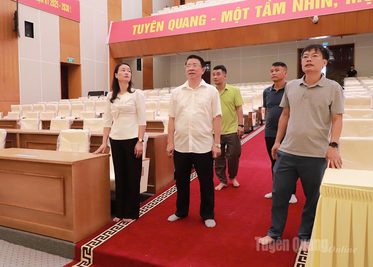 Trưởng ban Tuyên giáo và Dân vận Tỉnh ủy Trần Mạnh Lợi kiểm tra Hội trường tổ chức Đại hội đại biểu Đảng bộ tỉnh tại Trung tâm Hội nghị tỉnh.