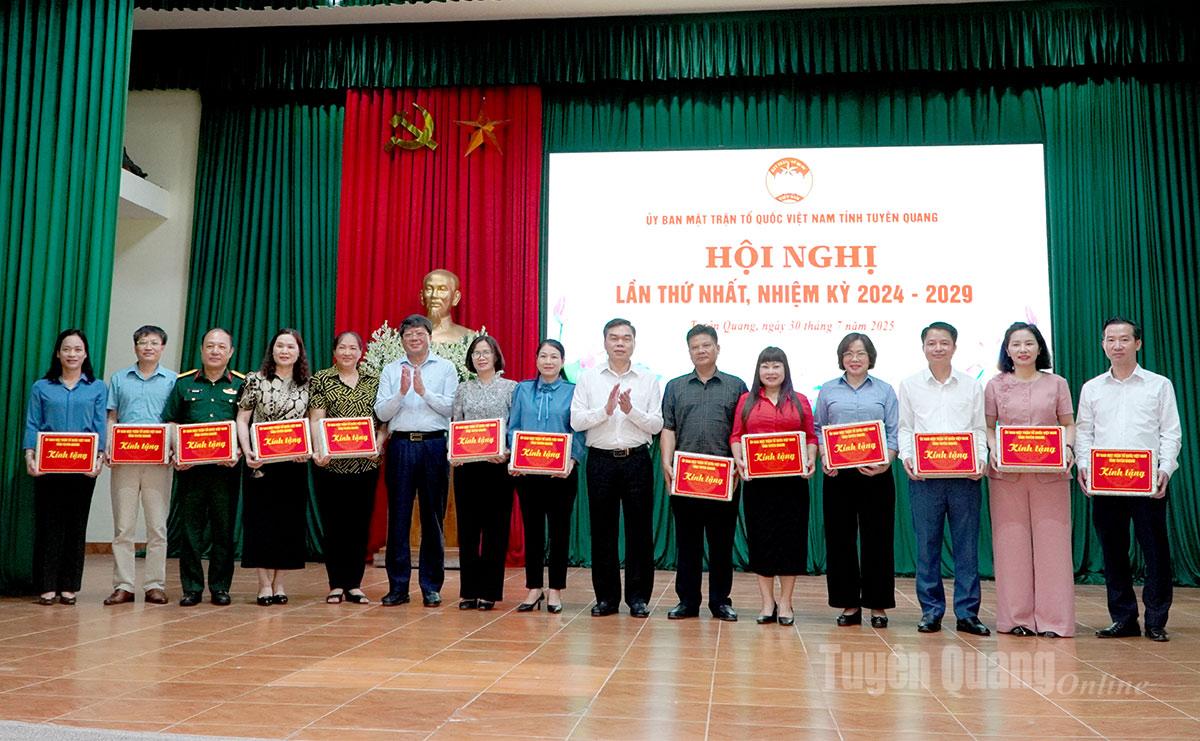 Các đồng chí Thường trực MTTQ Việt Nam tỉnh tặng quà cho các đồng chí Ủy viên Ủy ban thôi tham gia Ủy ban MTTQ Việt Nam tỉnh Nhiệm kỳ 2024 - 2029. Ảnh: Quốc Việt.