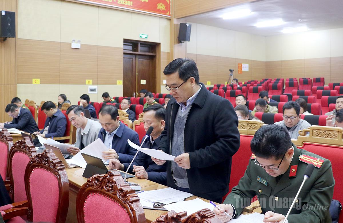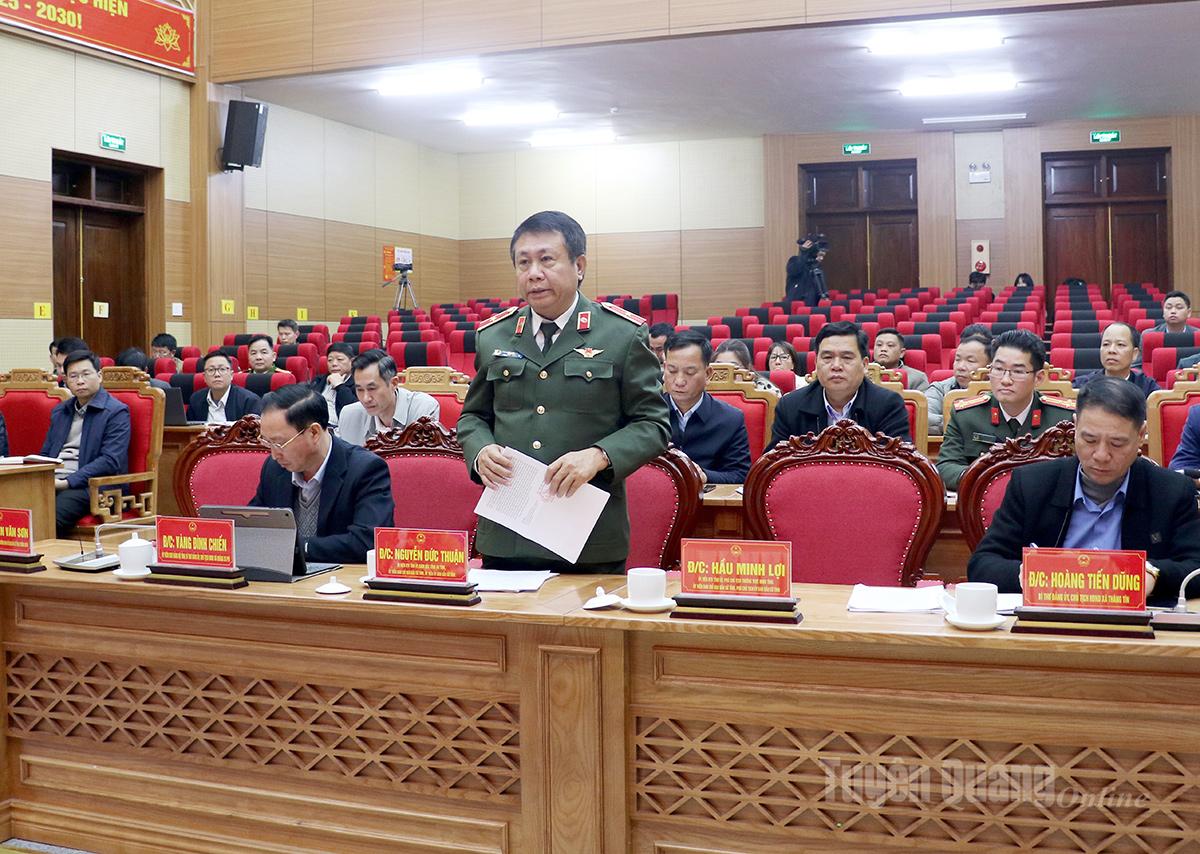 Thiếu tướng Nguyễn Đức Thuận, Ủy viên Ban Thường vụ Tỉnh ủy, Giám đốc Công an tỉnh, Ủy viên Ban Chỉ đạo bầu cử, Ủy viên Ủy ban bầu cử tỉnh phát biểu tại buổi làm việc.
