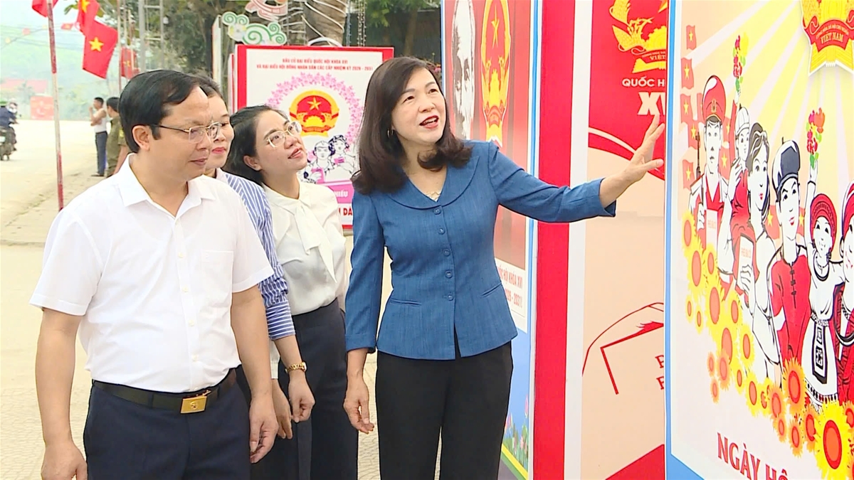 Phó Chủ tịch HĐND tỉnh Phạm Thị Minh Xuân kiểm tra công tác tuyên truyền phục vụ công tác bầu cử tại xã Vĩnh Tuy. Ảnh: Thu Hương.