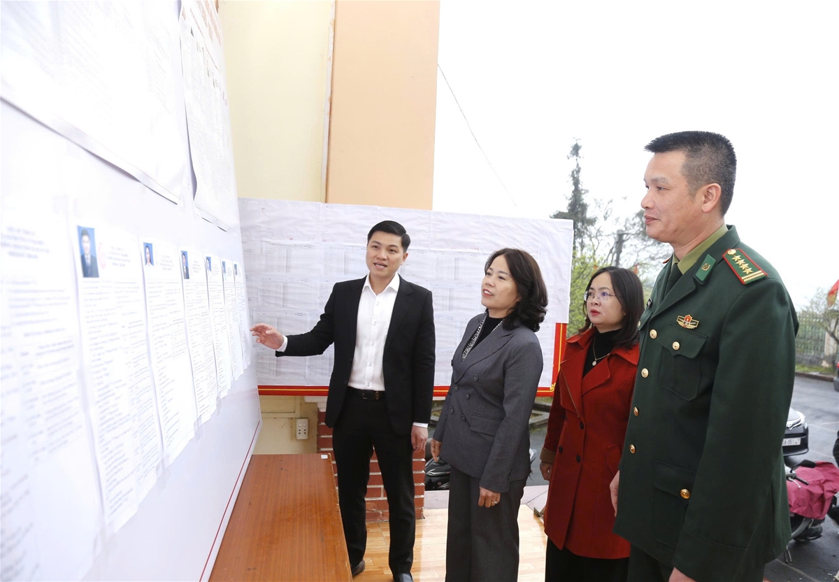 Đồng chí Lý Thị Lan, Ủy viên BTV Tỉnh ủy, Trưởng đoàn ĐBQH hoạt động chuyên trách khoá XV tỉnh Tuyên Quang kiểm tra công tác chuẩn bị bầu cử tại thôn Tam Sơn 1, xã Quản Bạ.