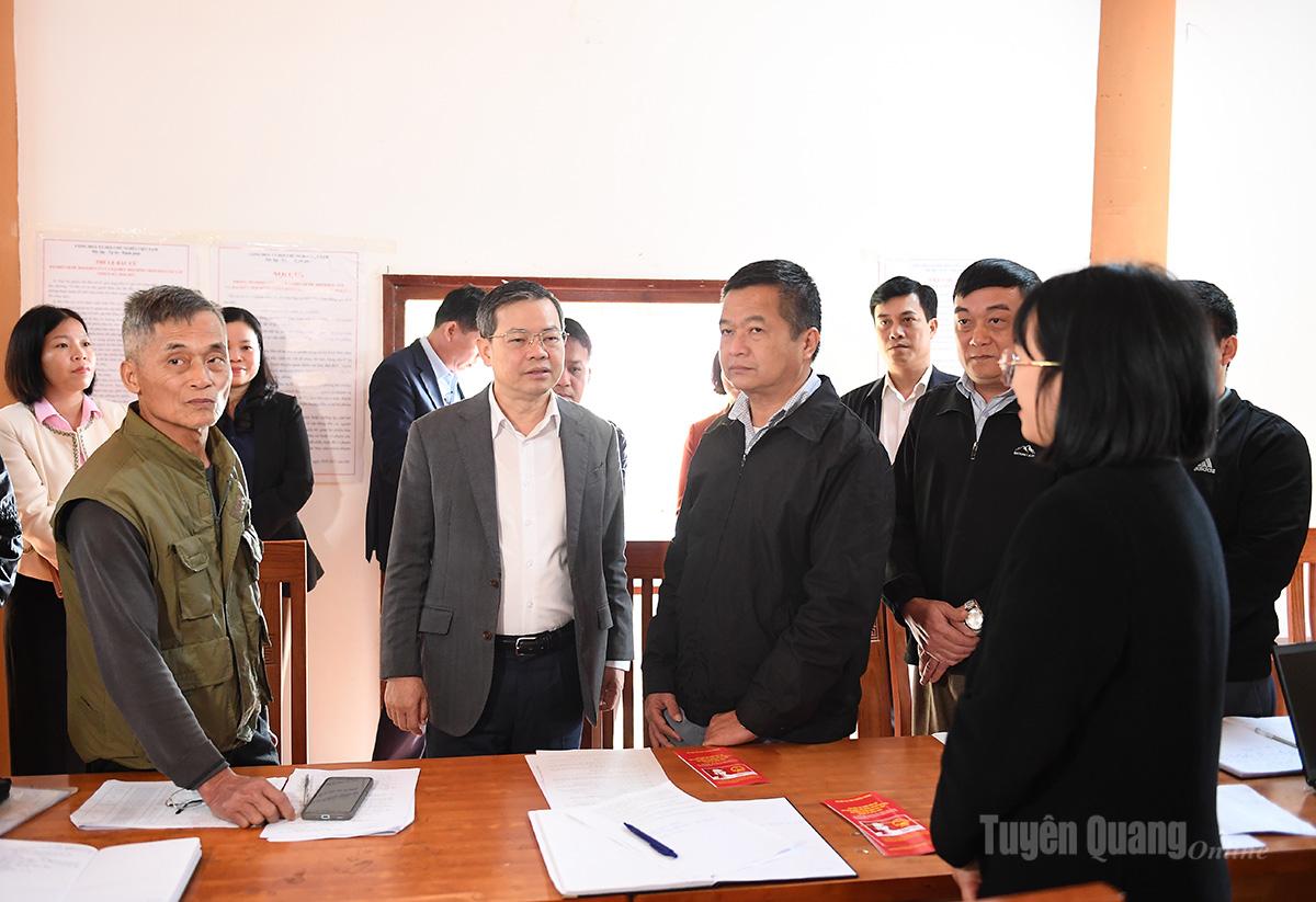 Chủ tịch HĐND tỉnh Nguyễn Văn Sơn và đoàn công tác kiểm tra khu vực ghi phiếu của cử tri tại khu vực bỏ phiếu thôn Tân Lập, xã Vĩnh Tuy.