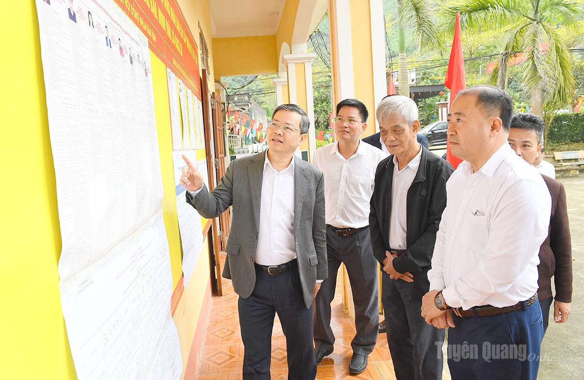 Chủ tịch HĐND tỉnh Nguyễn Văn Sơn kiểm tra việc niêm yết các danh sách ứng cử viên, cử tri tại điểm bỏ phiếu số 1 xã Bạch Xa.