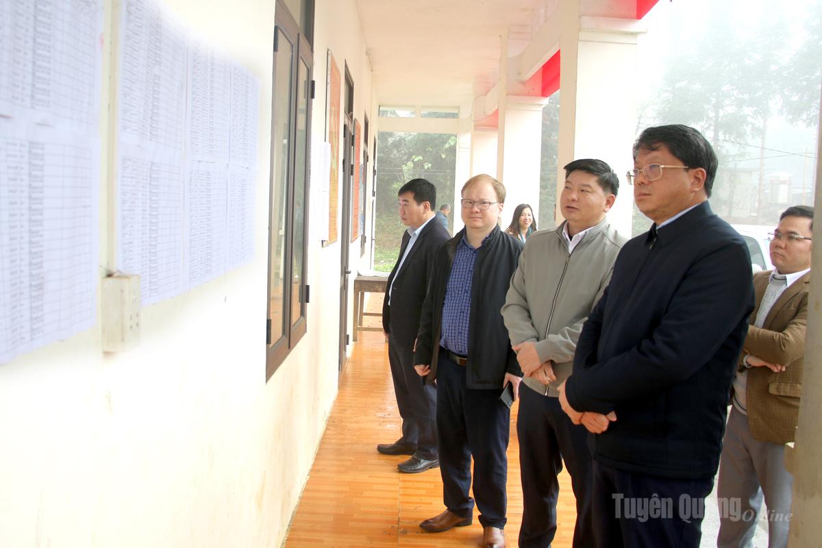 Đoàn kiểm tra danh sách cử tri niêm yết tại nhà văn hoá thôn Phiền Sủi, xã Giáp Trung.