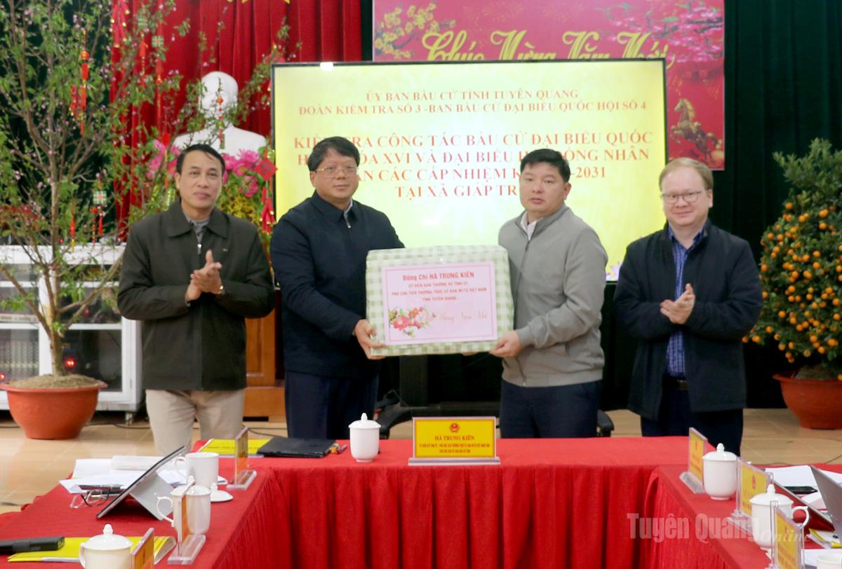 Phó Chủ tịch Thường trực Uỷ ban MTTQ tỉnh Hà Trung Kiên tặng quà cho Đảng uỷ, HĐND, UBND, Uỷ ban MTTQ Việt Nam xã Giáp Trung.