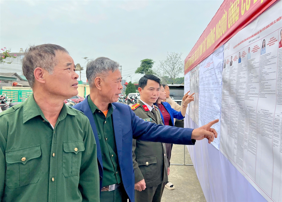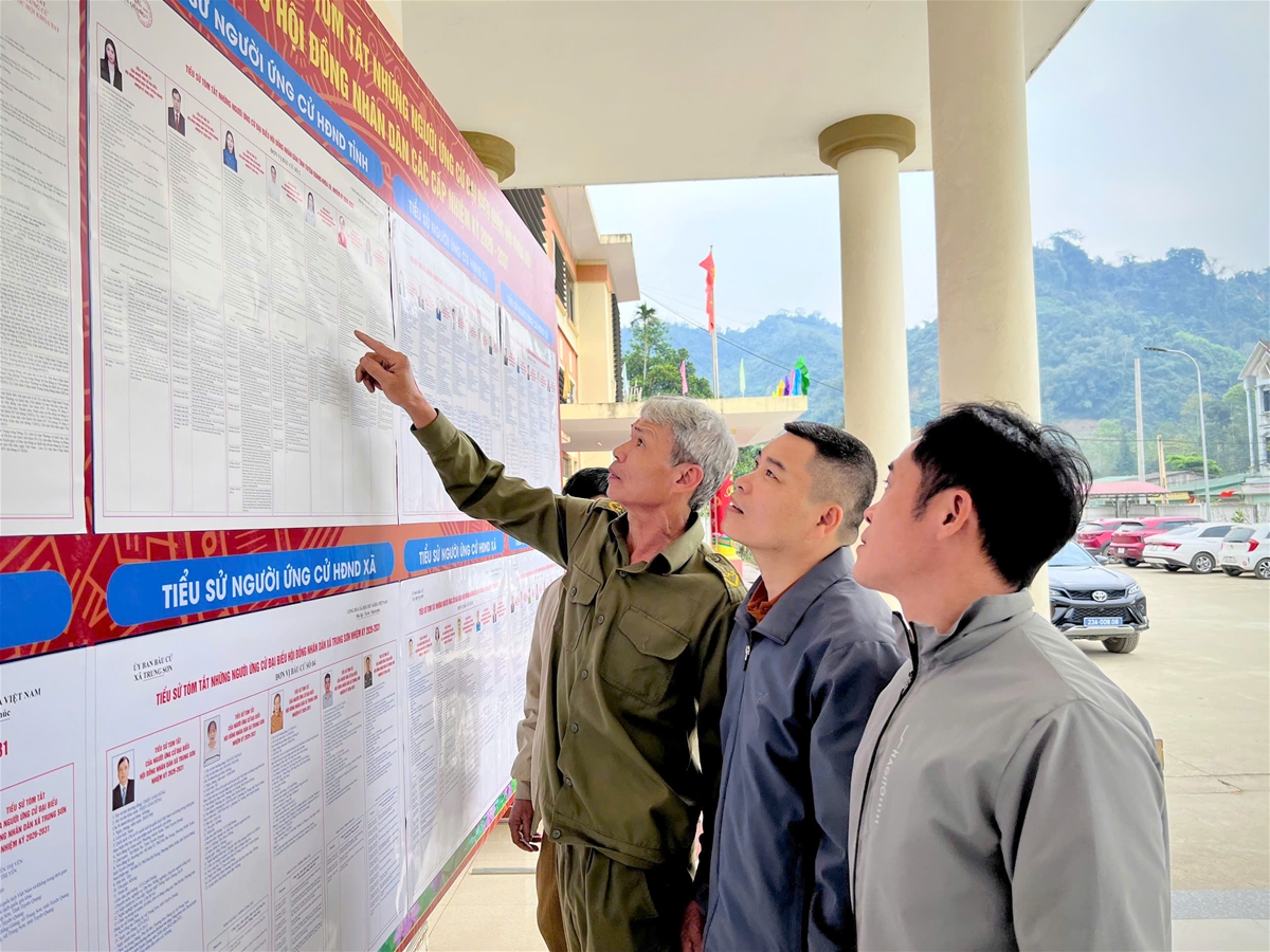 Cử tri xã Trung Sơn tìm hiểu tiểu sử các ứng cử viên.