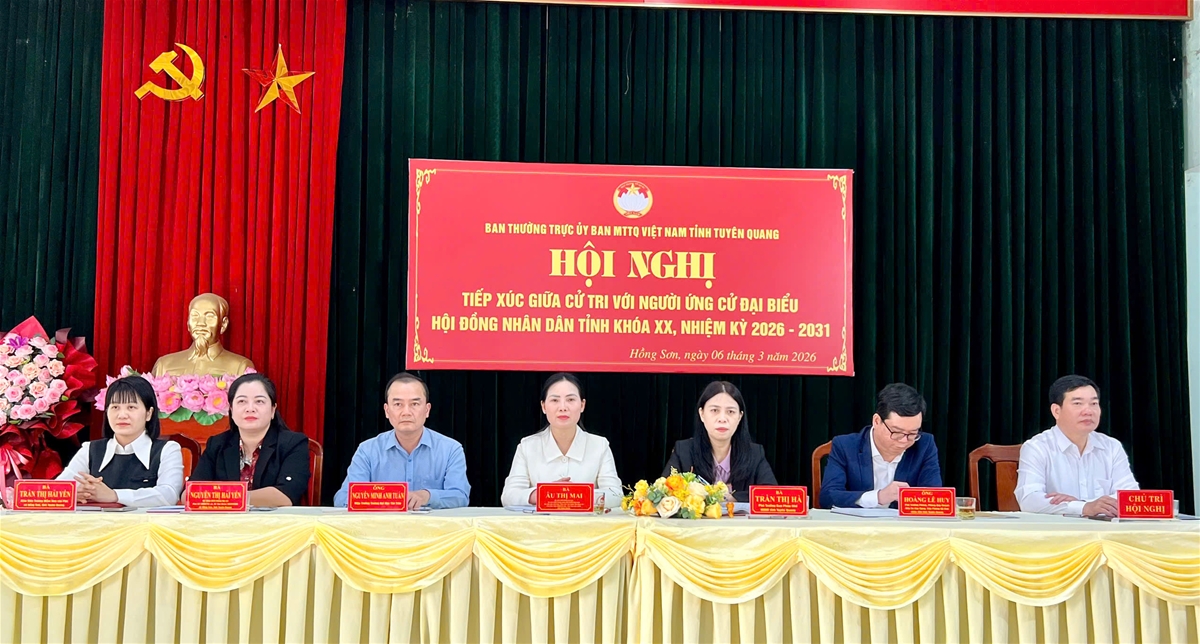 Dự hội nghị có các đồng chí: Âu Thị Mai, Uỷ viên Ban Chấp hành Đảng bộ tỉnh, Phó Chủ tịch Uỷ ban Mặt trận Tổ quốc Việt Nam tỉnh, Chủ tịch Hội Liên hiệp phụ nữ tỉnh Tuyên Quang; Trần Thị Hà, Phó Trưởng Ban Pháp chế Hội đồng nhân dân tỉnh; Hoàng Lê Huy, Phó Trưởng phòng Quy hoạch, Đầu tư và Xây dựng, Văn phòng Uỷ ban nhân dân tỉnh; Nguyễn Minh Anh Tuấn, Hiệu trưởng Trường Đại học Tân Trào; các đồng chí ứng cử viên đại biểu Hội đồng nhân dân tỉnh khóa XX thuộc đơn vị bầu cử số 2 cùng đông đảo cử tri các xã Trung Sơn, Hồng Sơn. Hội nghị do Ban Thường trực Ủy ban Mặt trận Tổ quốc Việt Nam tỉnh Tuyên Quang tổ chức.