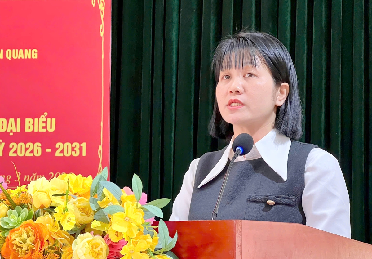 Ứng cử viên Trần Thị Hà, Phó Trưởng ban Pháp chế, HĐND tỉnh trình bày chương trình hành động tại hội nghị.