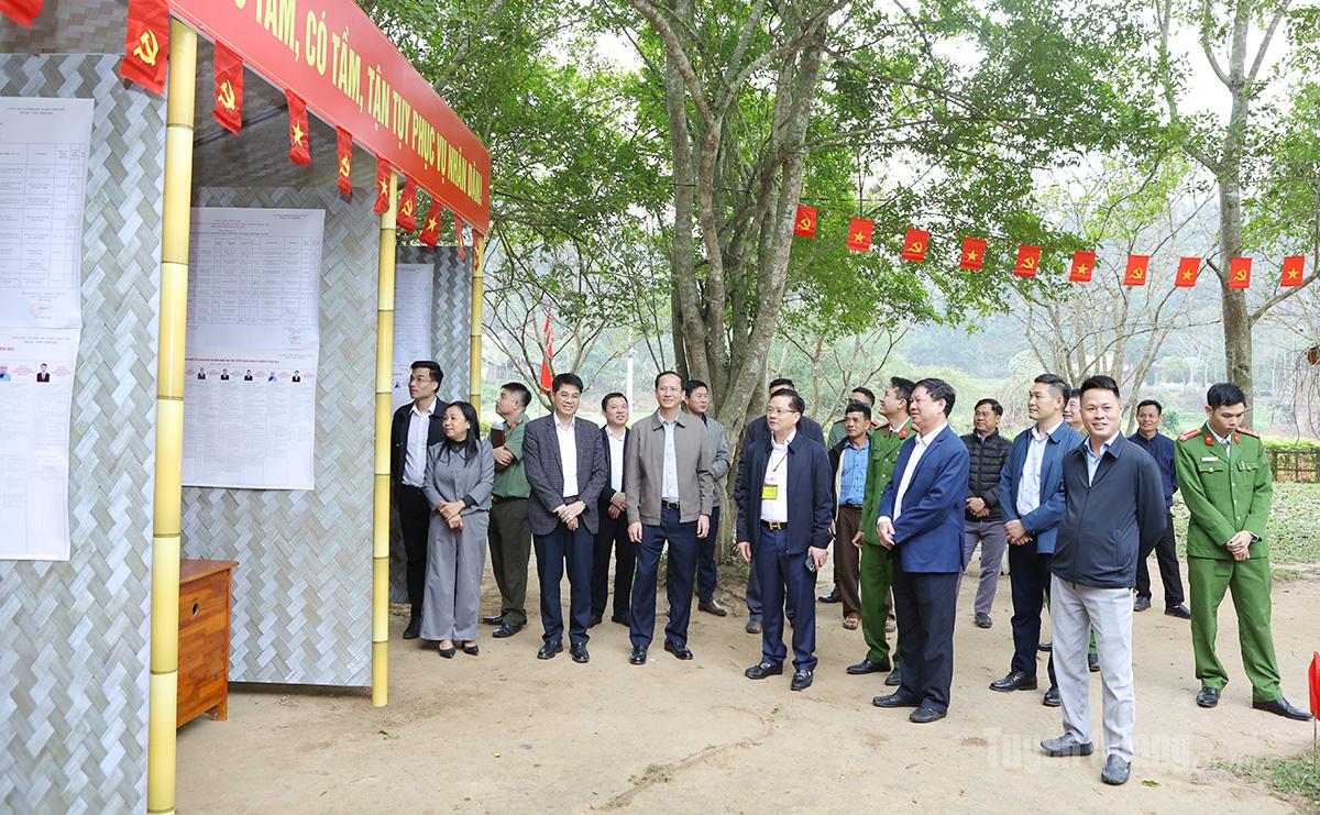 Đồng chí Trần Quang Minh, Ủy viên Ban Thường vụ Tỉnh ủy, Trưởng Ban Tổ chức Tỉnh ủy, Ủy viên Ban Chỉ đạo Bầu cử tỉnh, Trưởng Ban Bầu cử đại biểu HĐND tỉnh số 1 nắm tình hình, kiểm tra cơ sở vật chất tại các điểm bỏ phiếu tại thôn Tân Lập, xã Tân Trào.