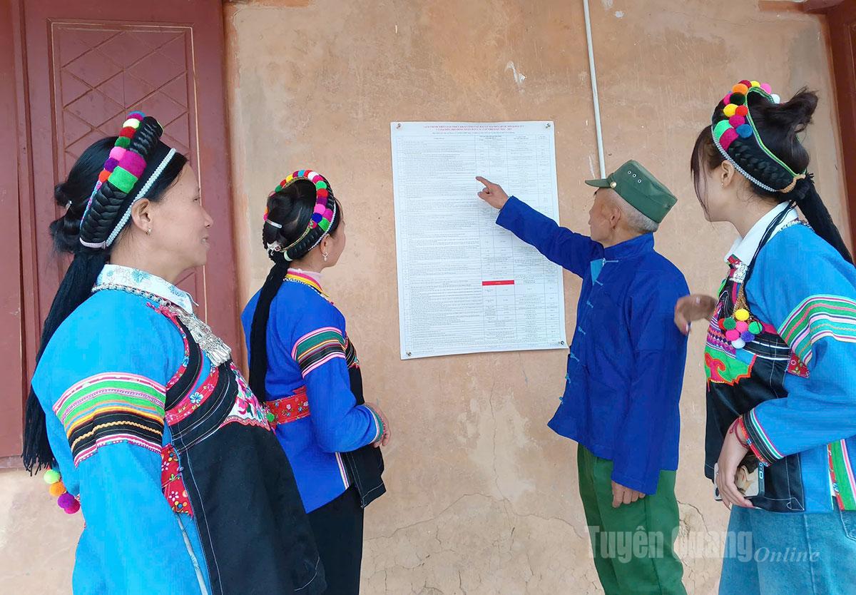 Đồng bào dân tộc Phù Lá ở thôn Chúng Trải, xã Xín Mần xem các mốc thời gian và nội dung liên quan đến cuộc bầu cử.