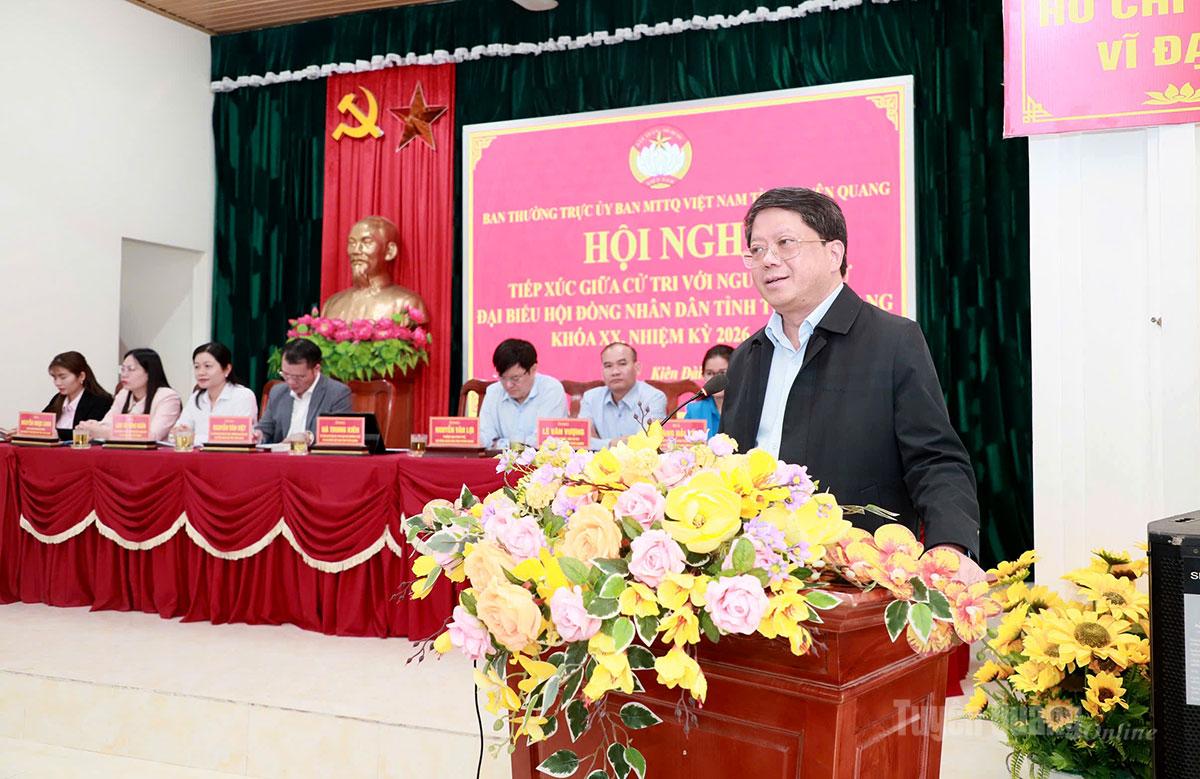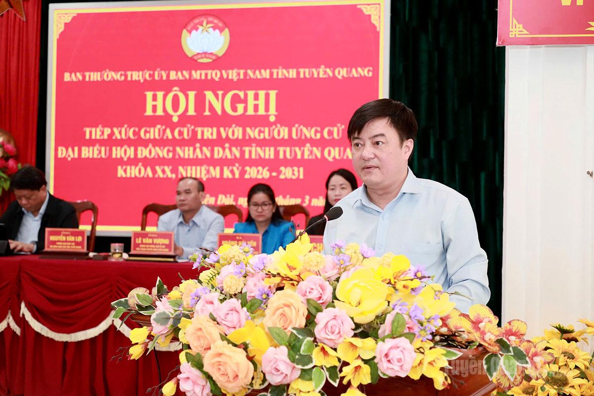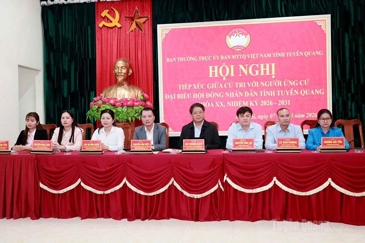 Đại diện Ủy ban MTTQ Việt Nam tỉnh đã lần lượt giới thiệu tóm tắt tiểu sử, quá trình công tác của các ứng cử viên đại biểu HĐND tỉnh khóa XX, nhiệm kỳ 2026 – 2031 gồm các ông, bà: Hà Trung Kiên, Ủy viên BTV Tỉnh ủy, Phó Chủ tịch Thường trực Ủy ban MTTQ Việt Nam tỉnh; Nguyễn Ngọc Loan, Công chức phòng Nội chính, Văn phòng UBND tỉnh; Nguyễn Văn Lợi, Trưởng ban Pháp chế, HĐND tỉnh; Lâm Thị Hồng Ngân, Bí thư Đảng ủy, Chủ tịch HĐND xã Kiên Đài; Nguyễn Văn Việt, Tỉnh ủy viên, Trưởng ban Dân tộc, HĐND tỉnh; Lê Văn Vượng, Chánh văn phòng Báo và phát thanh, truyền hình Tuyên Quang; Hoàng Thị Hải Yến, Phó Trưởng ban Công tác công đoàn, Ủy ban MTTQ Việt Nam tỉnh; Hoàng Thị Yến, Giáo viên trường Mầm non Hùng Mỹ, xã Tân Mỹ.