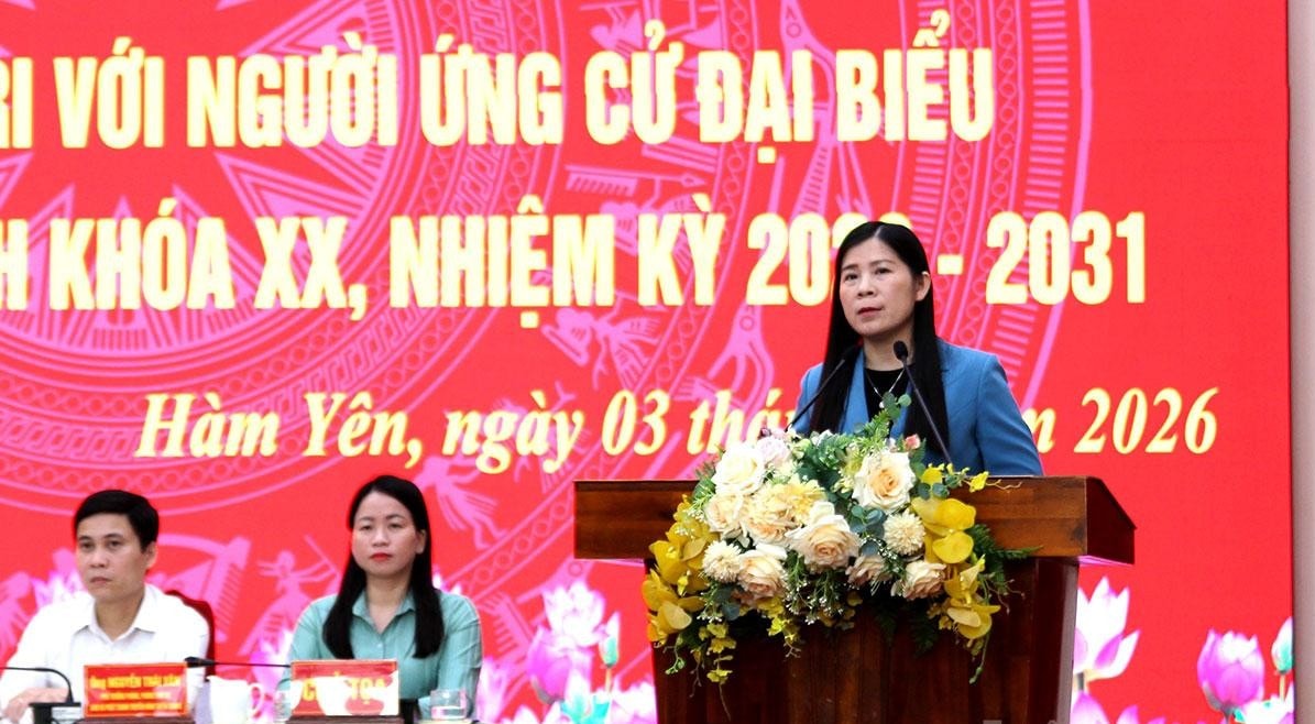 Phó Chủ tịch HĐND tỉnh Lê Thị Thanh Trà phát biểu tại hội nghị TXCT xã Hàm Yên. Ảnh: Thanh Phúc.
