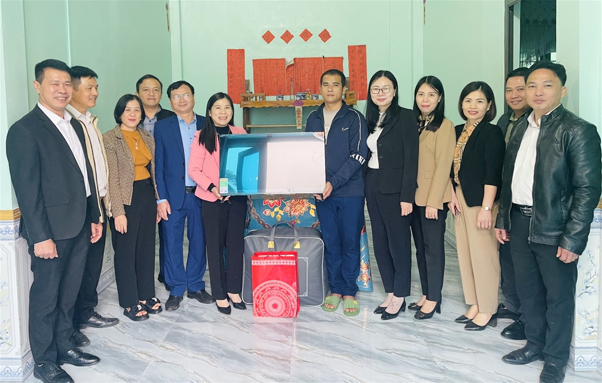 Đồng chí Lê Thị Thanh Trà, Phó Chủ tịch HĐND tỉnh và Lãnh đạo các Ban HĐND tỉnh, công chức, người lao động Văn phòng tặng quà gia đình ông Hoàng Văn Cao, thôn Bản Man, xã Bình Phú. Ảnh Yến Phương.