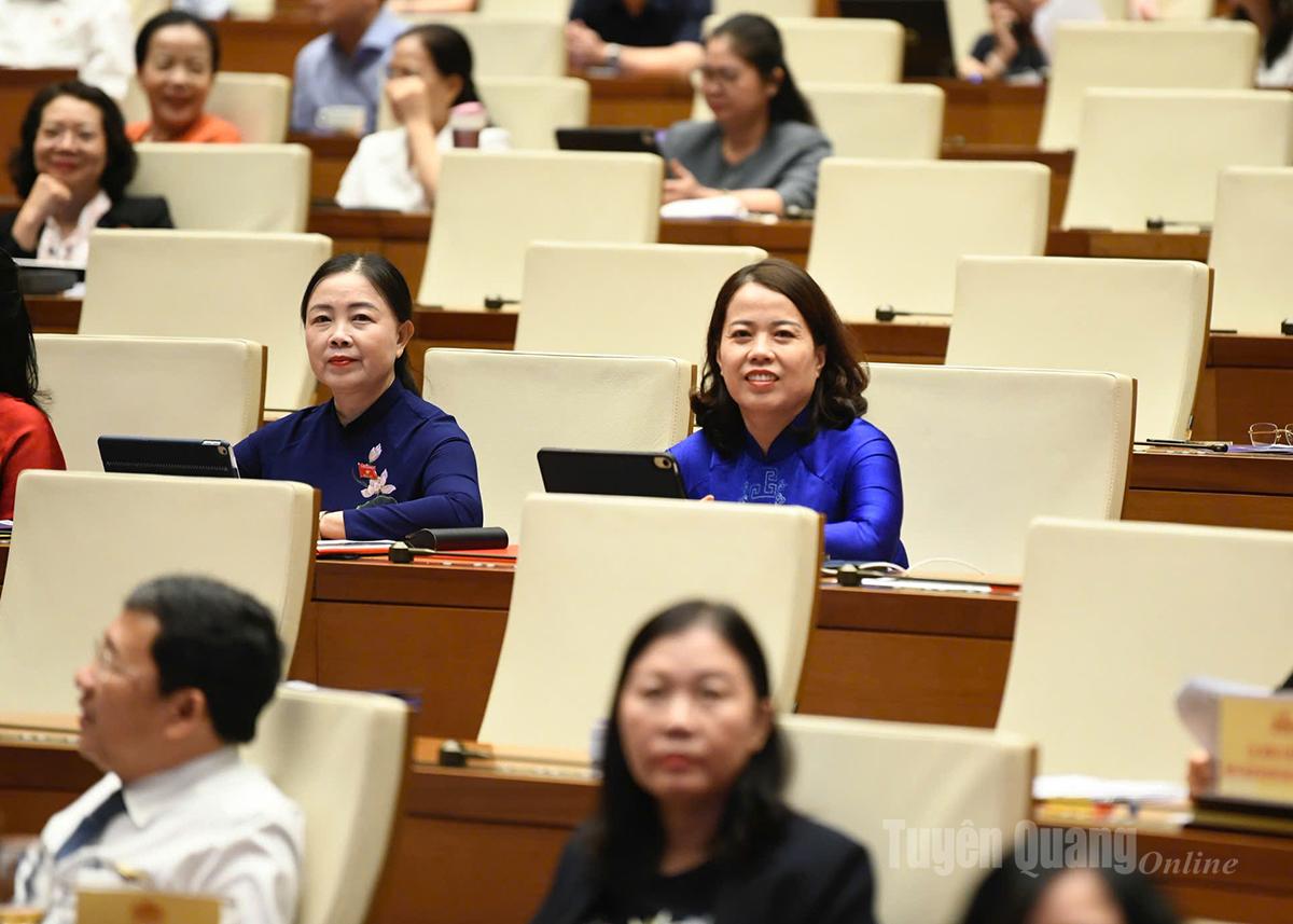 Đồng chí Lý Thị Lan, Ủy viên Ban Thường vụ Tỉnh ủy, Trưởng Đoàn đại biểu Quốc hội chuyên trách tỉnh Tuyên Quang (hàng sau, bên phải) tham dự Hội nghị trực tiếp tại Nhà Quốc hội, Hà Nội.