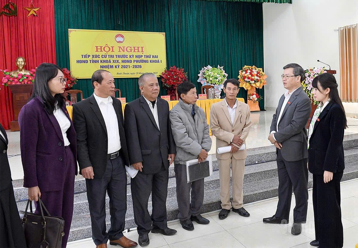 Phó Bí thư Tỉnh ủy, Chủ tịch HĐND tỉnh Nguyễn Văn Sơn trao đổi với cử tri phường Bình Thuận. Ảnh: Thu Hương.