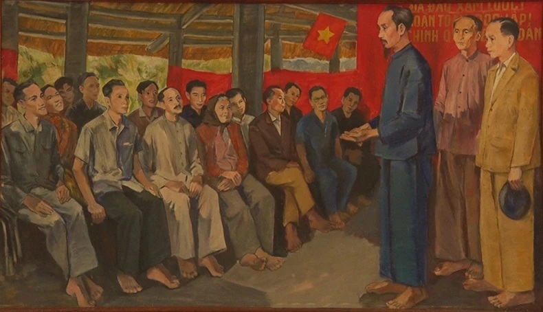 Chủ tịch Hồ Chí Minh nói chuyện với đại biểu Quốc dân Đại hội tại Đình Tân Trào. Ảnh: nhandan.vn.