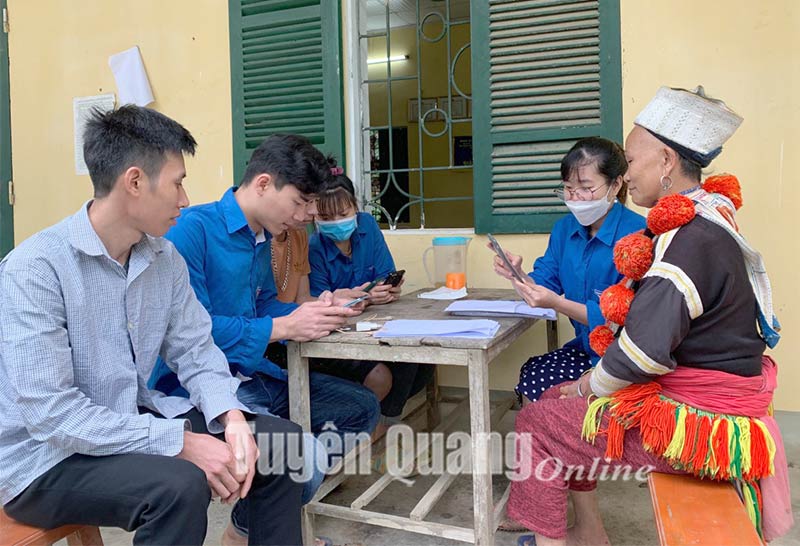 Các thành viên Tổ công nghệ số xã Minh Hương (Hàm Yên) hướng dẫn người dân cài đặt ứng dụng dịch vụ công trực tuyến.