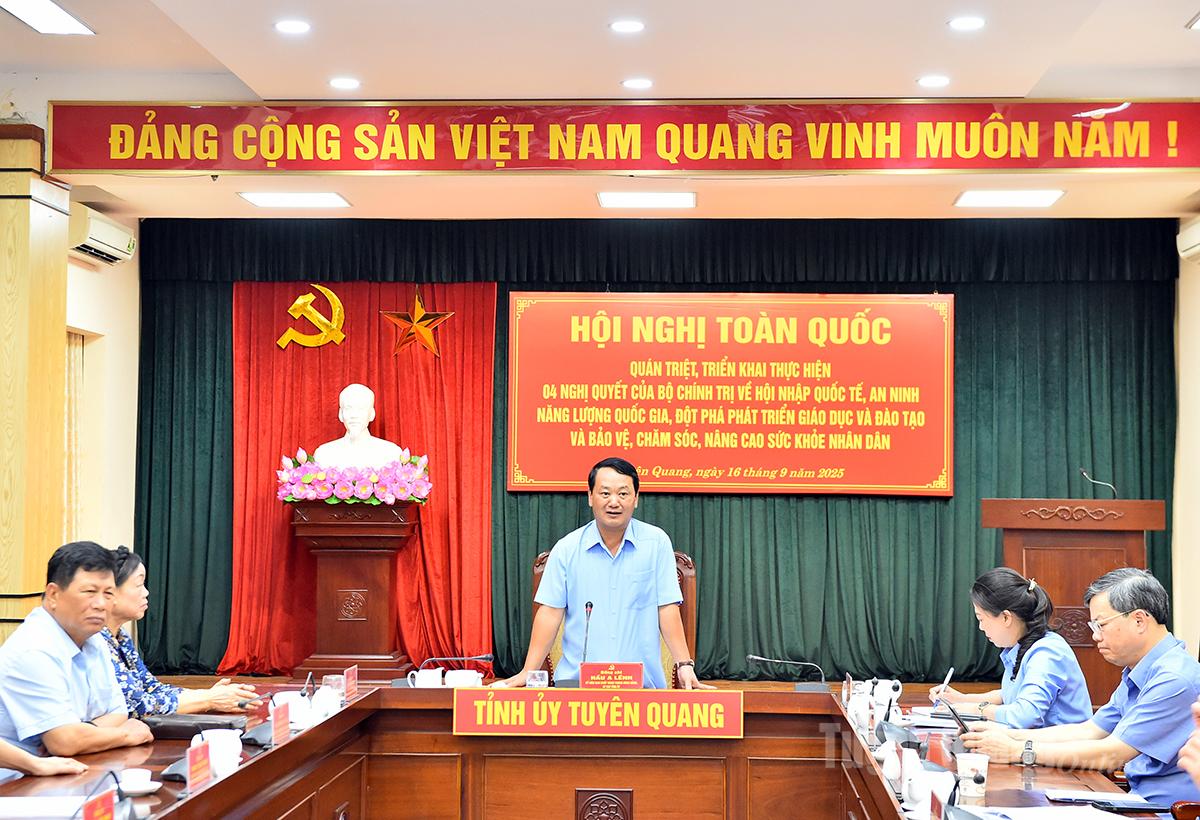 Phát biểu chỉ đạo hội nghị, Tổng Bí thư Tô Lâm nhấn mạnh: Việc quán triệt và triển khai đồng bộ, hiệu quả các nghị quyết của Bộ Chính trị, Ban Bí thư có ý nghĩa đặc biệt quan trọng, góp phần cụ thể hóa đường lối của Đảng, đáp ứng yêu cầu phát triển đất nước trong giai đoạn mới. Tổng Bí thư đề nghị với tinh thần khẩn trương, các cấp ủy, tổ chức đảng, chính quyền, MTTQ và các đoàn thể chính trị - xã hội tập trung lãnh đạo, chỉ đạo, tạo sự thống nhất cao về nhận thức và hành động, sớm đưa nghị quyết vào cuộc sống, tạo chuyển biến rõ rệt trong từng lĩnh vực, nhất là giáo dục, y tế, hội nhập quốc tế và bảo đảm an ninh năng lượng.