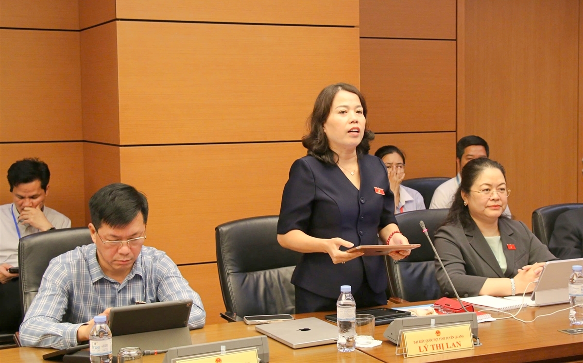 Đồng chí Lý Thị Lan, Ủy viên Ban Thường vụ Tỉnh ủy, Phó Trưởng đoàn đại biểu Quốc hội hoạt động chuyên trách tỉnh phát biểu tại tổ.