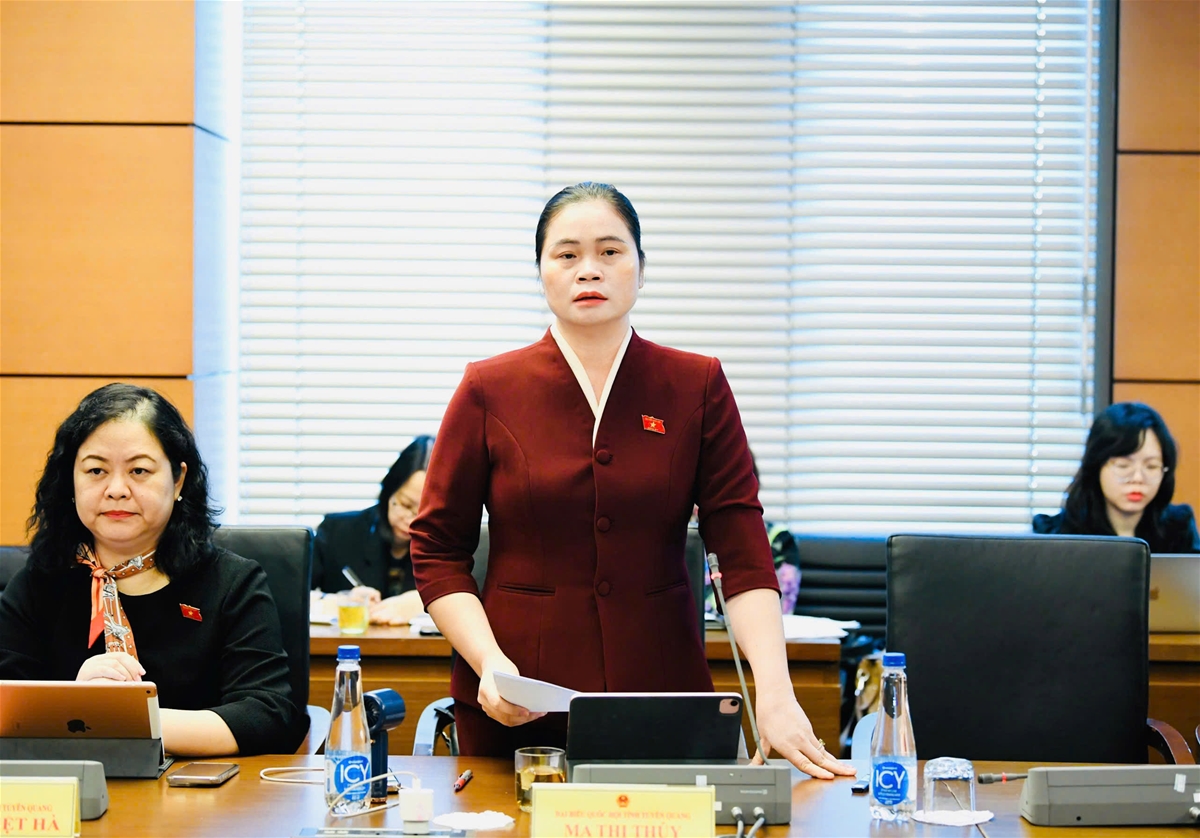 Đại biểu Ma Thị Thúy, Ủy viên Ban Chấp hành Đảng bộ tỉnh, Phó Trưởng Đoàn đại biểu Quốc hội hoạt động chuyên trách tỉnh phát biểu