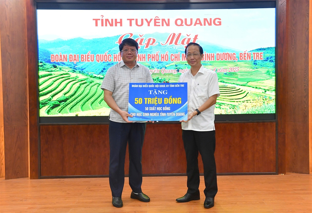 Nhân dịp này, đoàn đại biểu Quốc hội thành phố Hồ Chí Minh và tỉnh Bình Dương đã tặng Quỹ xóa nhà tạm, nhà dột nát của tỉnh Tuyên Quang 600 triệu đồng; đoàn đại biểu Quốc hội tỉnh Bến Tre tặng 50 suất học bổng, mỗi suất 1 triệu đồng cho 50 học sinh có hoàn cảnh khó khăn trên địa bàn tỉnh./.