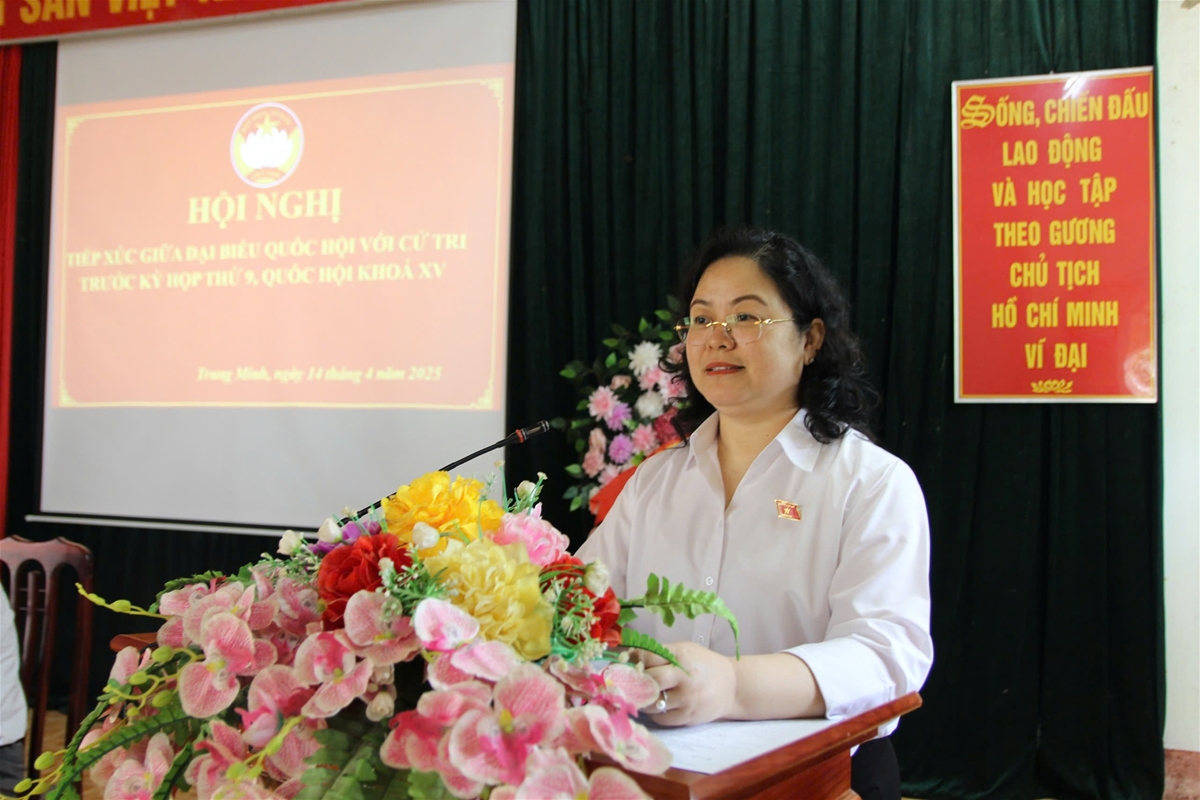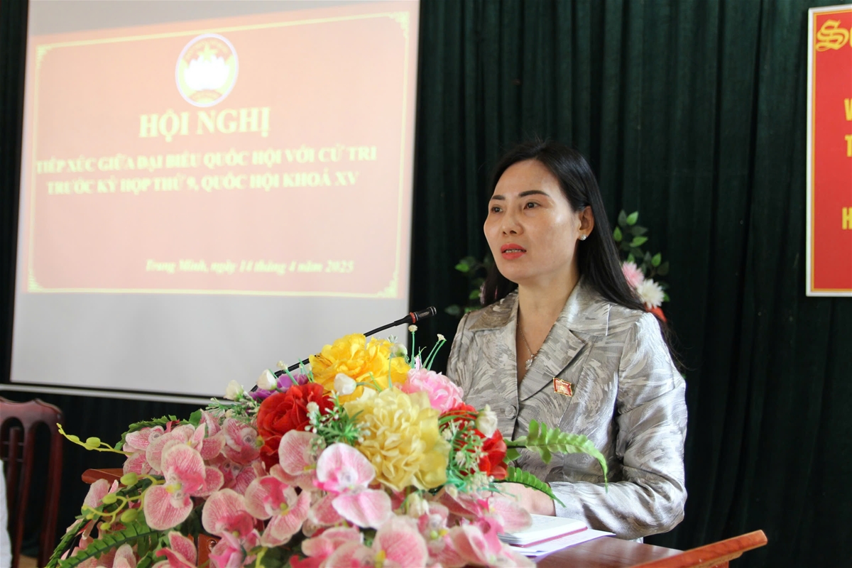 Phát biểu tại hội nghị, bà Âu Thị Mai, Ủy viên Ban Chấp hành Đảng bộ tỉnh, Giám đốc Sở Văn hóa, Thể thao và Du lịch, đại biểu Quốc hội tỉnh tiếp thu các ý kiến của cử tri tại hội nghị và trực tiếp chia sẻ, trao đổi thêm về những vấn đề mà cử tri quan tâm. Các nội dung cử tri kiến nghị sẽ được Đoàn đại biểu Quốc hội tỉnh tổng hợp đầy đủ và chuyển đến Quốc hội, các Bộ, ngành Trung ương, địa phương xem xét, giải quyết./.