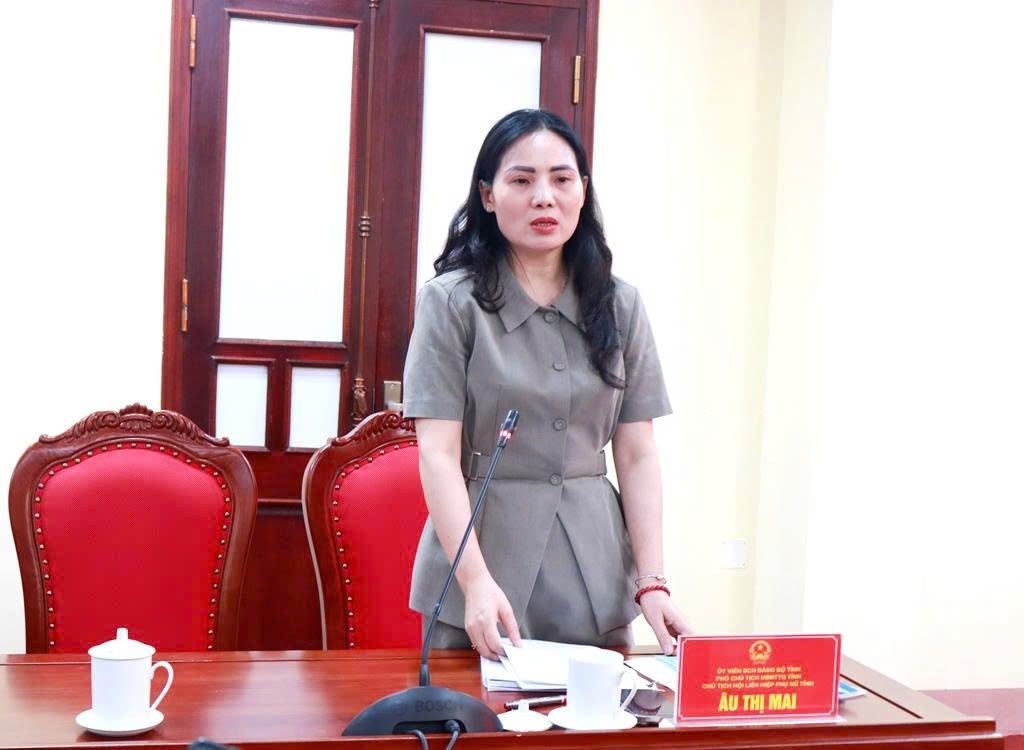 Đồng chí Âu Thị Mai, Ủy viên BCH Đảng bộ tỉnh, Phó Chủ tịch Ủy ban Mặt trận Tổ quốc tỉnh, Chủ tịch Hội Liên hiệp phụ nữ tỉnh phát biểu tại buổi làm việc.