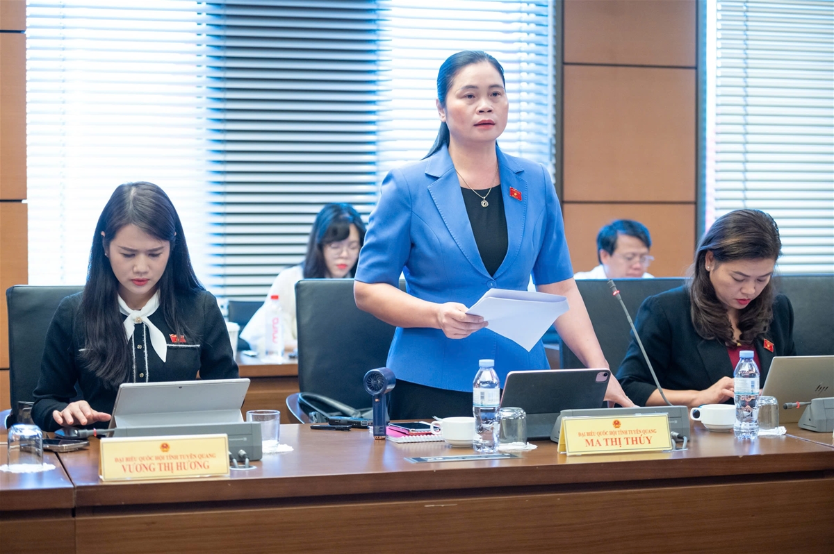 Đại biểu Ma Thị Thúy, Ủy viên Ban Chấp hành Đảng bộ tỉnh, Phó Trưởng Đoàn đại biểu Quốc hội hoạt động chuyên trách tỉnh tham gia ý kiến