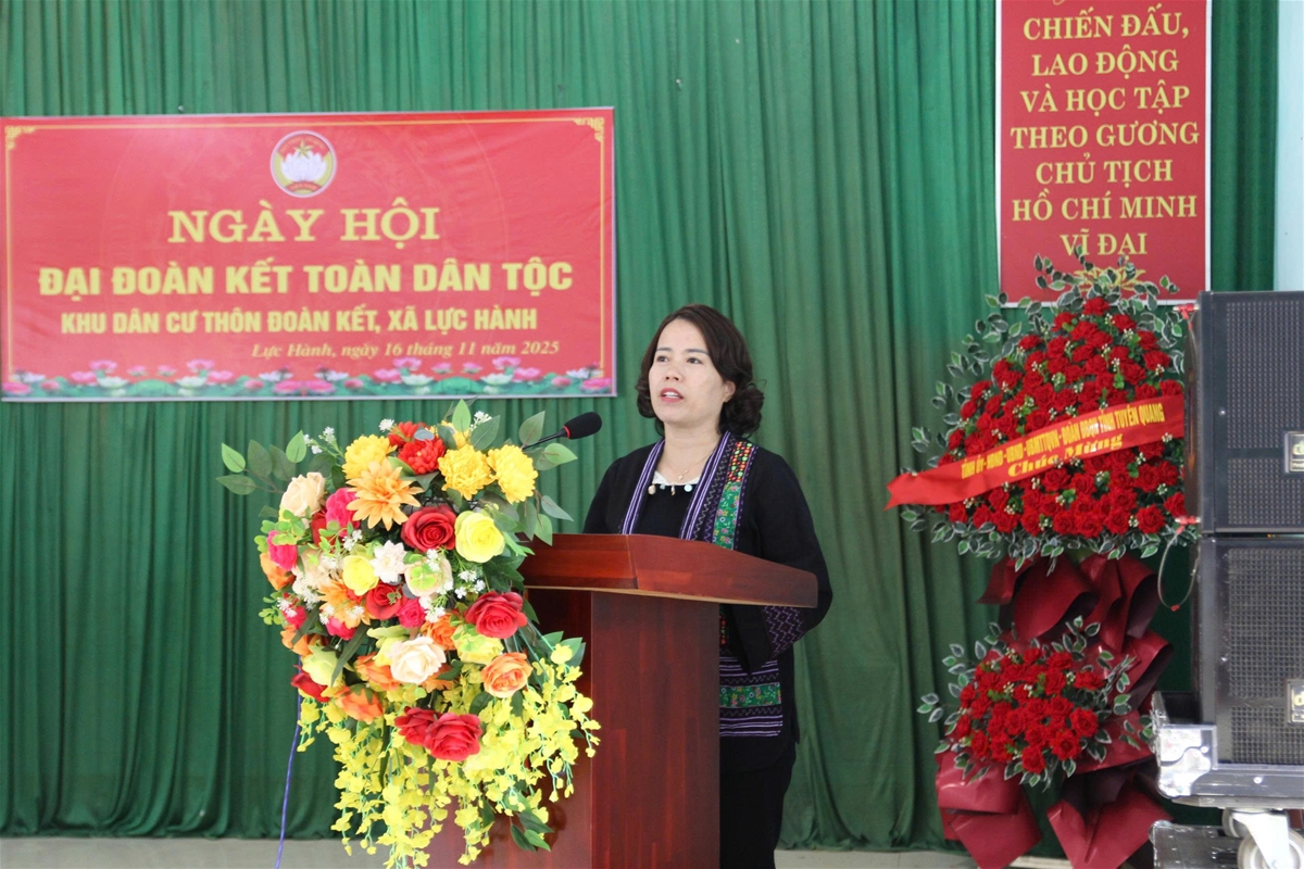 Phát biểu tại Ngày hội, đồng chí Lý Thị Lan, Uỷ viên BTV Tỉnh uỷ, Trưởng Đoàn ĐBQH hoạt động chuyên trách khoá XV tỉnh ghi nhận và biểu dương những nỗ lực của cấp ủy, chính quyền xã Lực Hành và đặc biệt là tinh thần đoàn kết, cố gắng vượt khó của bà con Nhân dân thôn Đoàn Kết. Đồng chí nhấn mạnh, những đổi thay về kinh tế, diện mạo nông thôn và đời sống văn hóa là minh chứng rõ nét cho sức mạnh đại đoàn kết toàn dân tộc, là nền tảng quan trọng để địa phương thực hiện thắng lợi các mục tiêu phát triển.