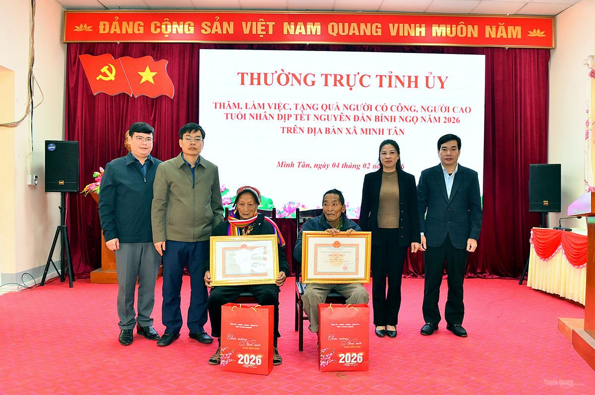 Đồng chí Phó Bí thư Thường trực Tỉnh ủy Lê Thị Kim Dung cùng các thành viên đoàn công tác trao Mừng thọ của Chủ tịch UBND tỉnh cho các cụ cao niên xã Minh Tân.