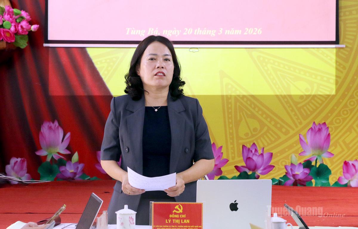 Phát biểu tại buổi làm việc, đồng chí Lý Thị Lan, Ủy viên Ban Thường vụ Tỉnh ủy, Trưởng đoàn ĐBQH chuyên trách khoá XV tỉnh biểu dương, ghi nhận kết quả mà Đảng ủy xã Tùng Bá đã đạt được trong thời gian qua. Để tiếp tục thực hiện thắng lợi các mục tiêu, nhiệm vụ, đồng chí đề nghị Đảng ủy xã tiếp tục đoàn kết, thống nhất, triển khai đồng bộ các giải pháp trong quá trình thực hiện; đẩy mạnh công tác kiểm tra, giám sát; quan tâm phát triển đảng viên, nhất là đảng viên đồng bào dân tộc thiểu số; ưu tiên nguồn lực phát triển những thế mạnh của địa phương; đào tạo nghề, giải quyết việc làm; bám nắm cơ sở, kịp thời tháo gỡ những vướng mắc trong Nhân dân; tuyên truyền nâng cao nhận thức của người dân chuyển đổi cơ cấu, cây trồng vật nuôi; đẩy mạnh chuyển đổi số.