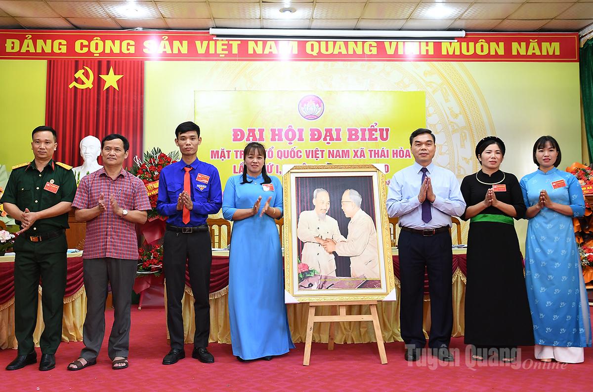 Đồng chí Phó Bí thư Tỉnh ủy, Chủ tịch Ủy ban MTTQ Việt Nam tỉnh Tuyên Quang Ma Thế Hồng tặng Đại hội đại biểu MTTQ Việt Nam xã Thái Hòa bức tranh Chủ tịch Hồ Chí Minh.