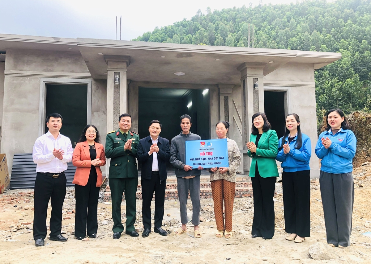 Đồng chí Phó Chủ tịch Hội đồng nhân dân tỉnh Phạm Thị MInh Xuân và đồng chí Dương Minh Nguyệt Phó Chủ tịch Ủy ban MTTQ Việt Nam tỉnh, Bí thư Tỉnh đoàn trao hỗ trợ 60 đồng cho hộ gia đình xóa nhà tạm, nhà dột nát.